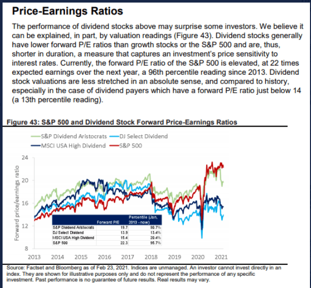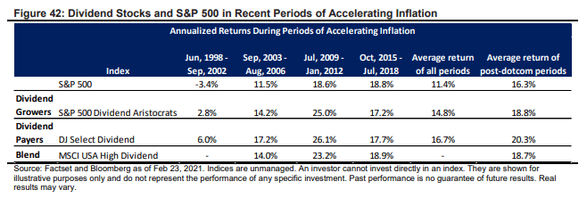 - History – Valuations are high for the index, but not everything is expensive. Dividend-paying stocks are relatively inexpensive and have historically more than held their own during periods of accelerating inflation, contrary to conventional wisdom.